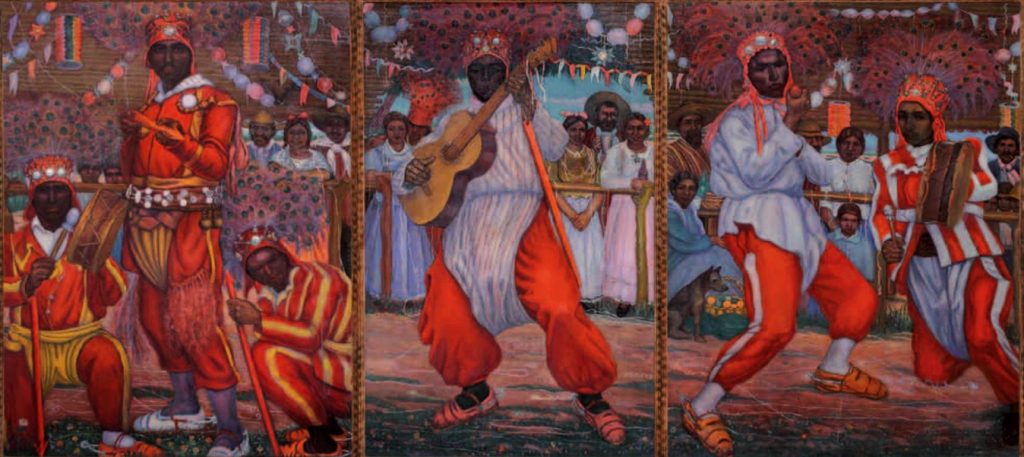 El tríptico de 1939, ganador del premio Ministerio de Instrucción Pública y Fomento de Santa Fe, retrata una comparsa de indios, formaciones que eran populares en las fiestas de carnaval en todo el Noroeste argentino desde principios del siglo XX y tuvieron un origen distinto al indio de carnaval que movilizó el criollismo popular a fines del siglo XIX.[19] Según afirma Rubén Pérez Bugallo, este tipo de agrupaciones surgieron a finales de los años veinte de los intercambios culturales entre migrantes de diversas provincias, desplazados de sus lugares de origen como consecuencia del empleo golondrina en trabajos estacionales como la zafra.[20] Los vínculos entre santiagueños, catamarqueños y jujeños con los habitantes de la zona del Gran Chaco dieron forma a estas comparsas que se caracterizaban por cantar vidalas y vestir adornos plumarios inspirados en los trajes festivos de las comunidades chaqueñas. A su vez, el cine norteamericano, a través de la popularidad alcanzada por el género del western, dejó también su marca en la confección del vestuario y la elección de los nombres de algunas de las comparsas –como fue el caso de “Los Pieles Rojas”, “Los Siux” y “Los Águila Blanca”– que supieron presentarse con asiduidad en los carnavales salteños.[21]