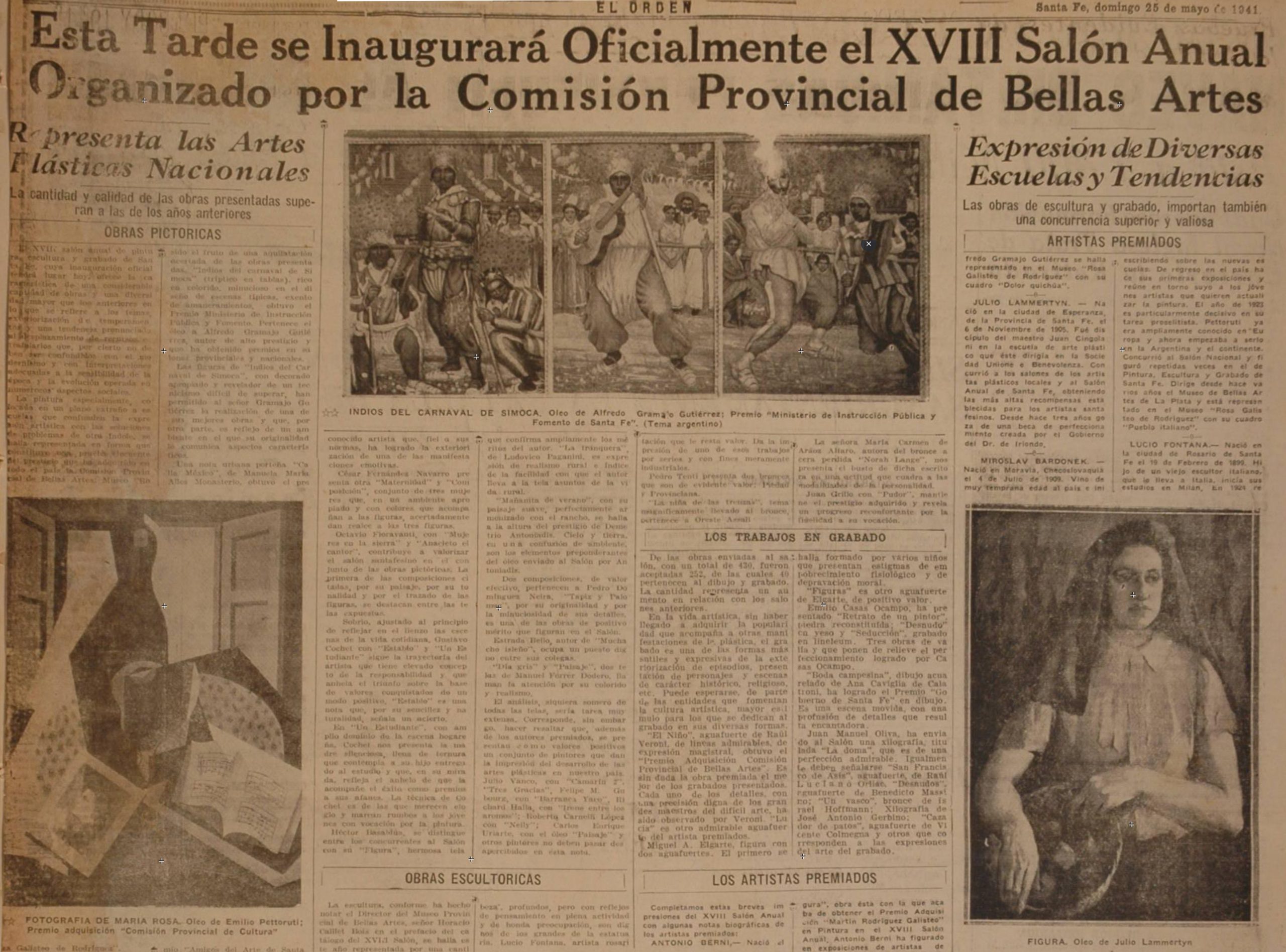 El 24 de mayo de 1941, un día antes de la inauguración del XVIII Salón Anual de Pintura, Escultura y Grabado de la ciudad de Santa Fe, un crítico anónimo publicó un extenso comentario en el diario El Litoral sobre aquello que sus lectores podían esperar al visitar la exhibición, así como sus pareceres acerca de los premios otorgados en el certamen. A lo largo de su crónica, acordaba con las decisiones del jurado y no dudaba en sostener que todos los galardones habían recaído con justeza en “obras de mérito”. Sin embargo, alertaba enfáticamente sobre una excepción en lo que respecta al Premio Ministerio de Instrucción Pública y Fomento de Santa Fe, adjudicado al tríptico Indios del carnaval de Simoca, del pintor tucumano Alfredo Gramajo Gutiérrez, quién para ese entonces contaba ya con una extensa y reconocida trayectoria.